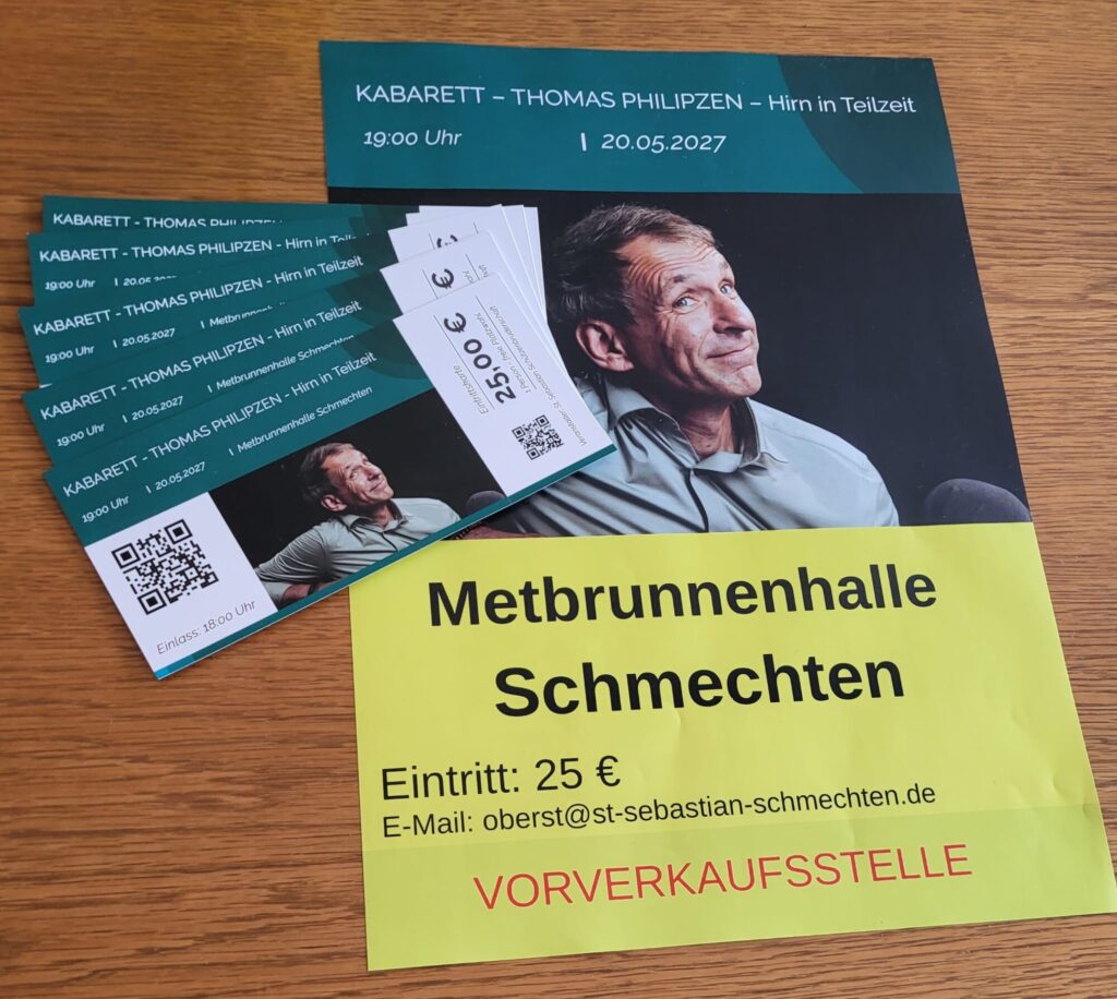 Am 20.05.2027 kommt Thomas Philipzen mit seinen Programm „Hirn in Teilzeit“ nach Schmechten! Beginn der Show ist um 19:00 Uhr. Bereits 1 Stunde vorher – also um 18:00 Uhr öffnen sich die Türen der Metbrunnenhalle. Der Eintrittspreis beträgt 25,00 €.